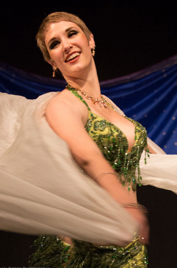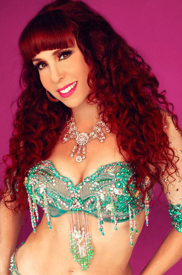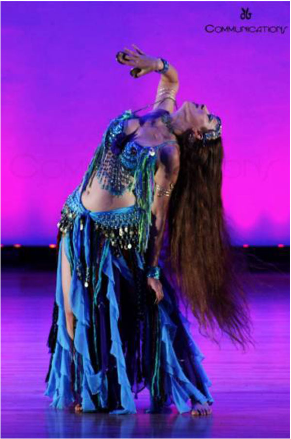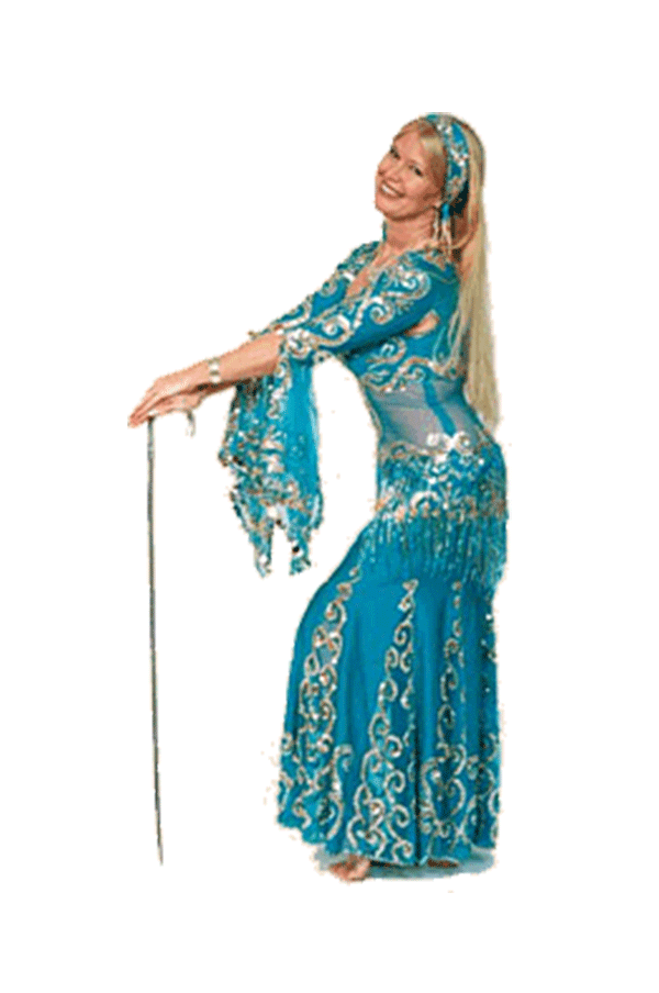 "I’ve been the proud owner of Egyptian costumes by Madame Abla, Madame Hekmet and current designers for Turquoise International – and can attest that these costumes are beautiful and well-made. While on tour in Cairo, Ali took us to Madame Abla’s design studio atelier and we had fittings by the legendary Madam Abla – who just measured us using her hands, making a few designer notes, and creating gorgeous personalized costumes that fit to a “t” within a week. What’s key to good costumes in performance is design elements shape to the body form and work well while dancing. Belt styling and design feature shaping that follows body form. Bra cups and strap placement are both secure, enhance cleavage, while providing comfortable support in a stylish manner."